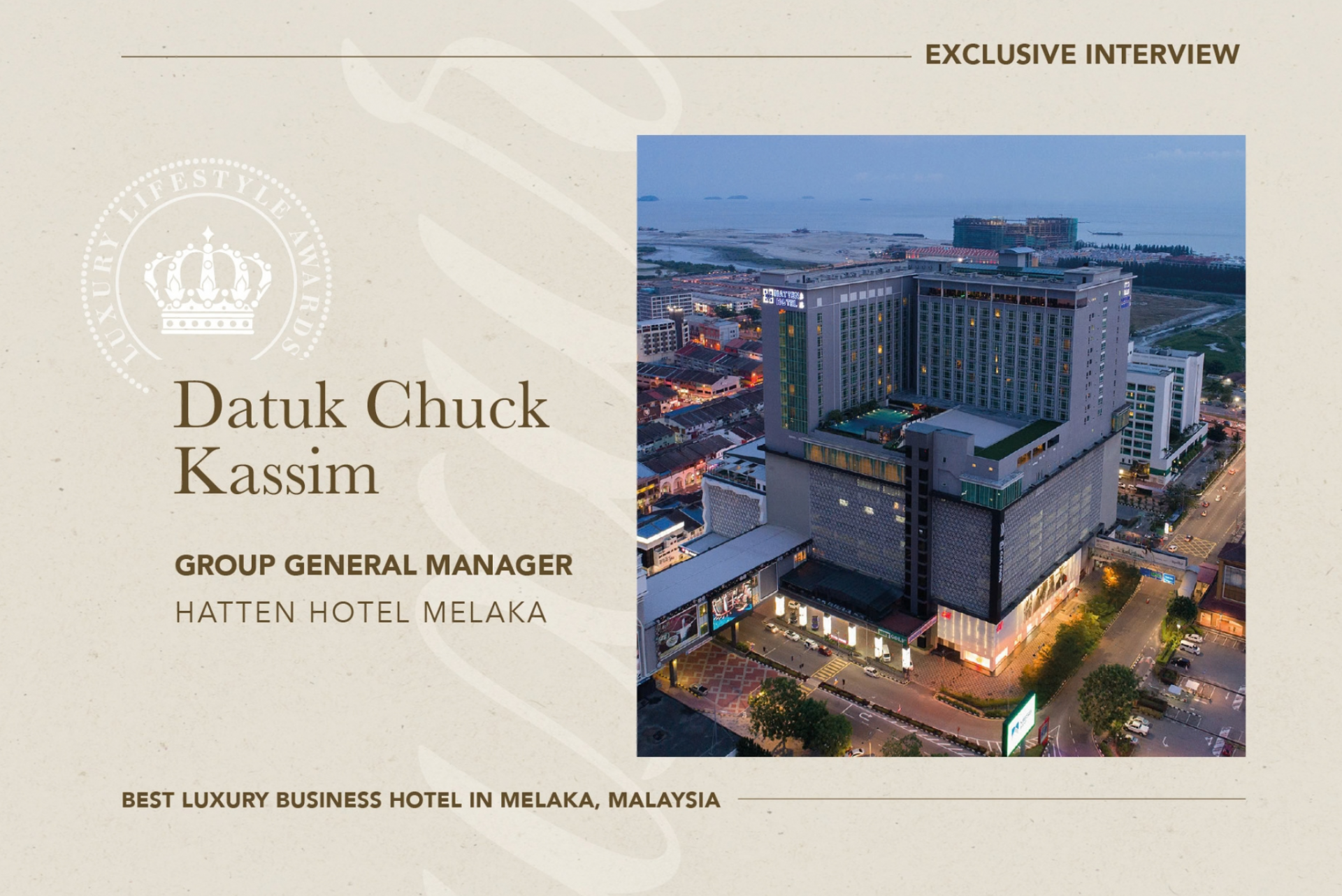 Datuk Chuck Kassim, Group General Manager of Hatten Hotel Melaka, oversees one of the city’s prominent five-star hospitality destinations, recognized by Luxury Lifestyle Awards as Best Luxury Business Hotel in Melaka, Malaysia. Located in the historic Bandar Hilir district, the hotel serves international travelers visiting Melaka’s UNESCO World Heritage landmarks while offering a contemporary hospitality environment designed for both business and leisure guests. In conversation with Alexander Chetchikov, President of the World Luxury Chamber of Commerce, Datuk Chuck Kassim reflects on leadership, service philosophy, and the evolving expectations of global travelers.