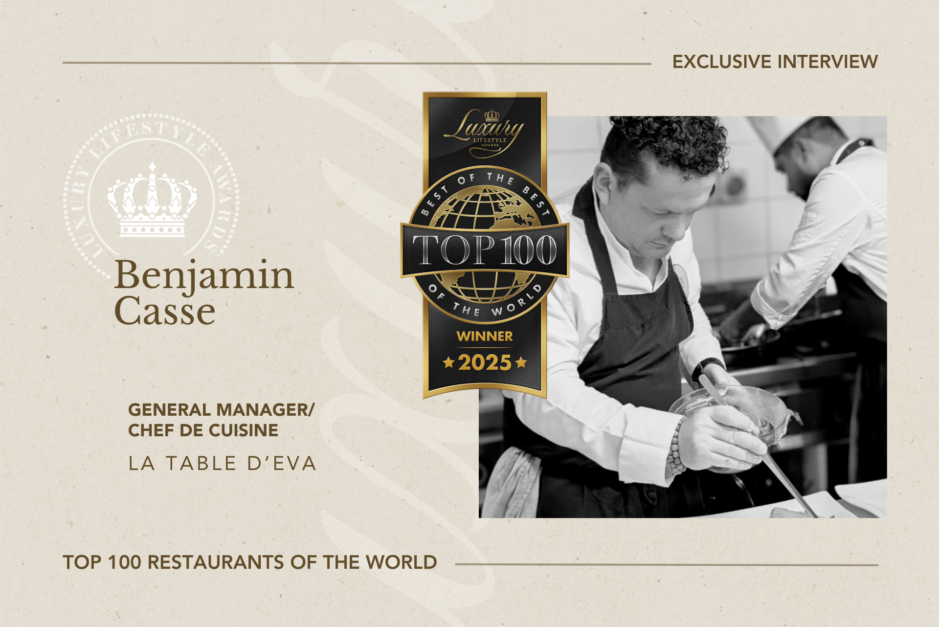 Alexander Chetchikov, President of the World Luxury Chamber of Commerce and founder of the Luxury Lifestyle Awards, leads the discussion with Benjamin Casse, Chef de Cuisine. In this exclusive interview, they explore the philosophy behind La Table D’Eva; the evolving trends in luxury dining, and Chef Casse’s trajectory.