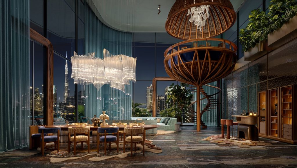 A dedicated double wellness level invites residents to a curated continuum of experiences designed to restore balance across body, mind, and spirit. Residents can enjoy six pools in total, including a 25-meter infinity pool and an indoor option, along with saunas, cryotherapy, and spa therapies drawn from East and West. A 15-meter-high Crystal Sound Meditation Pyramid, a contemplative labyrinth, and a Tiger Eye barefoot pathway invite sensory recalibration and energetic alignment. The Eywa Clubhouse anchors a cultural and social hub – library, private dining rooms, cinema and music terrace, and a refined lounge for connection and contemplation.