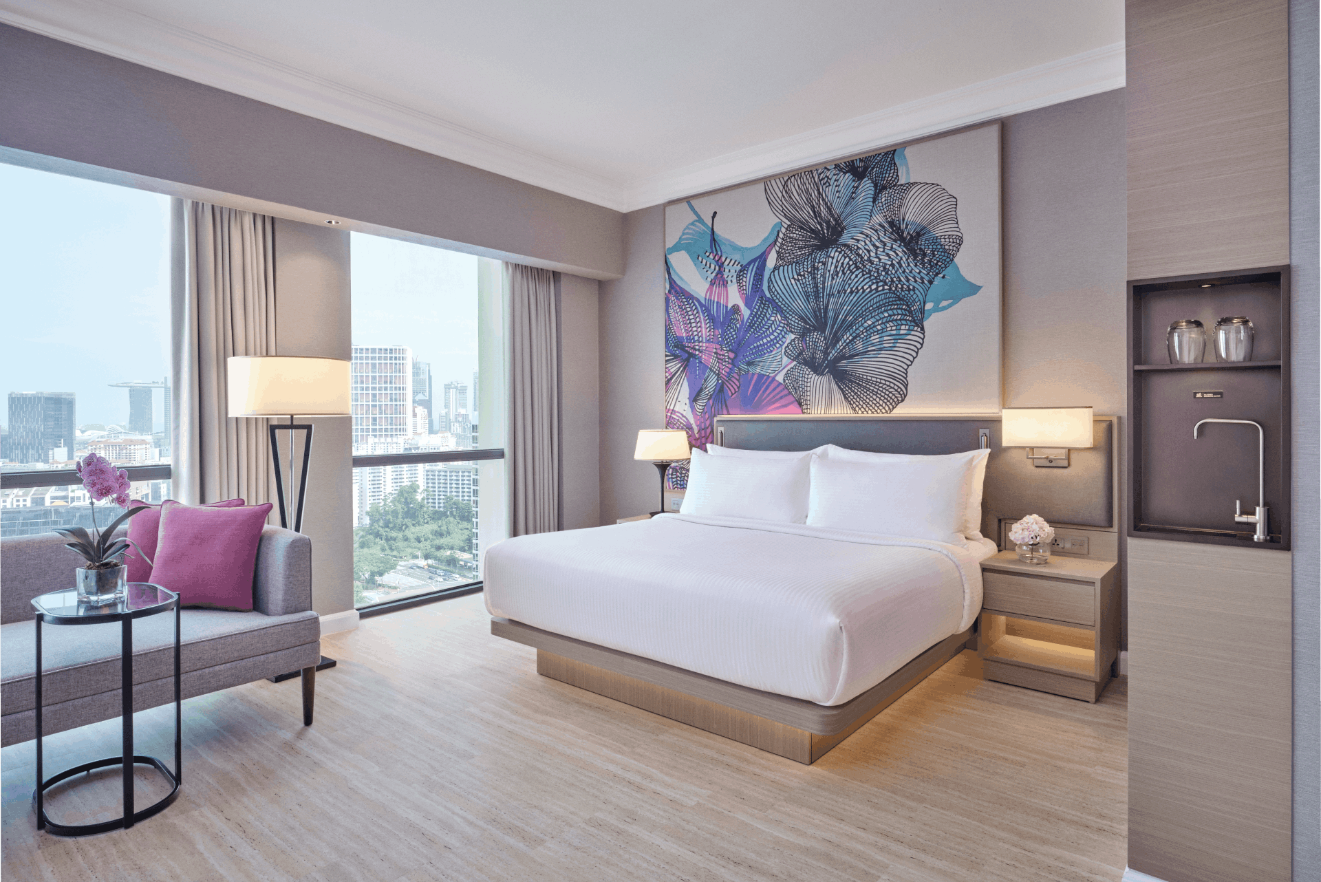 Grand Copthorne Waterfront’s 2023 rebirth marked one of Singapore’s most ambitious hotel renewal projects. With 573 redesigned rooms and suites, the hotel blends contemporary aesthetics with thoughtful comfort, offering full-length windows overlooking the Singapore River or the dramatic city skyline. Each room integrates intelligent technology and elevated finishes that enhance both convenience and serenity.