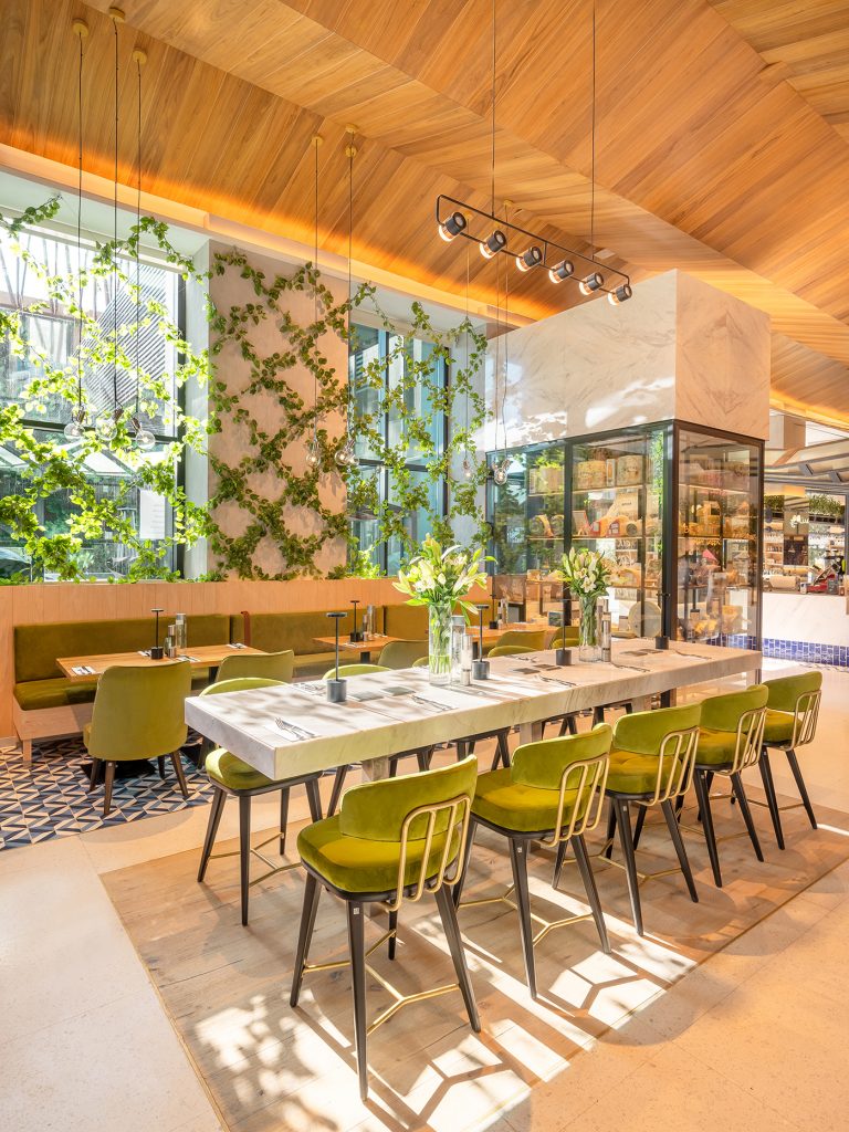 Inside the venue, you’ll find a walk-in cheese room, open show kitchens, communal seating, and a specialty grocery section where handcrafted condiments, small-batch jams, artisan teas, and mature cheeses line the shelves. This hybrid model, part café, part gourmet shop, part culinary atelier, embodies a modern luxury that celebrates craft, provenance, and experiential dining.