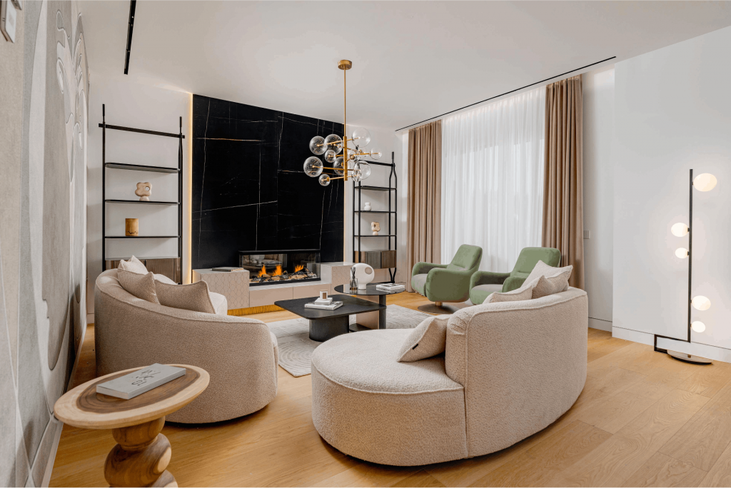 Other projects, including high-end penthouse residences and adaptive reuse interiors, illustrate Noblesse Group International’s sensitivity to architectural context. Whether working within contemporary structures or historic buildings, the studio approaches each space with respect for its structural framework while introducing modern functionality and refined detailing.