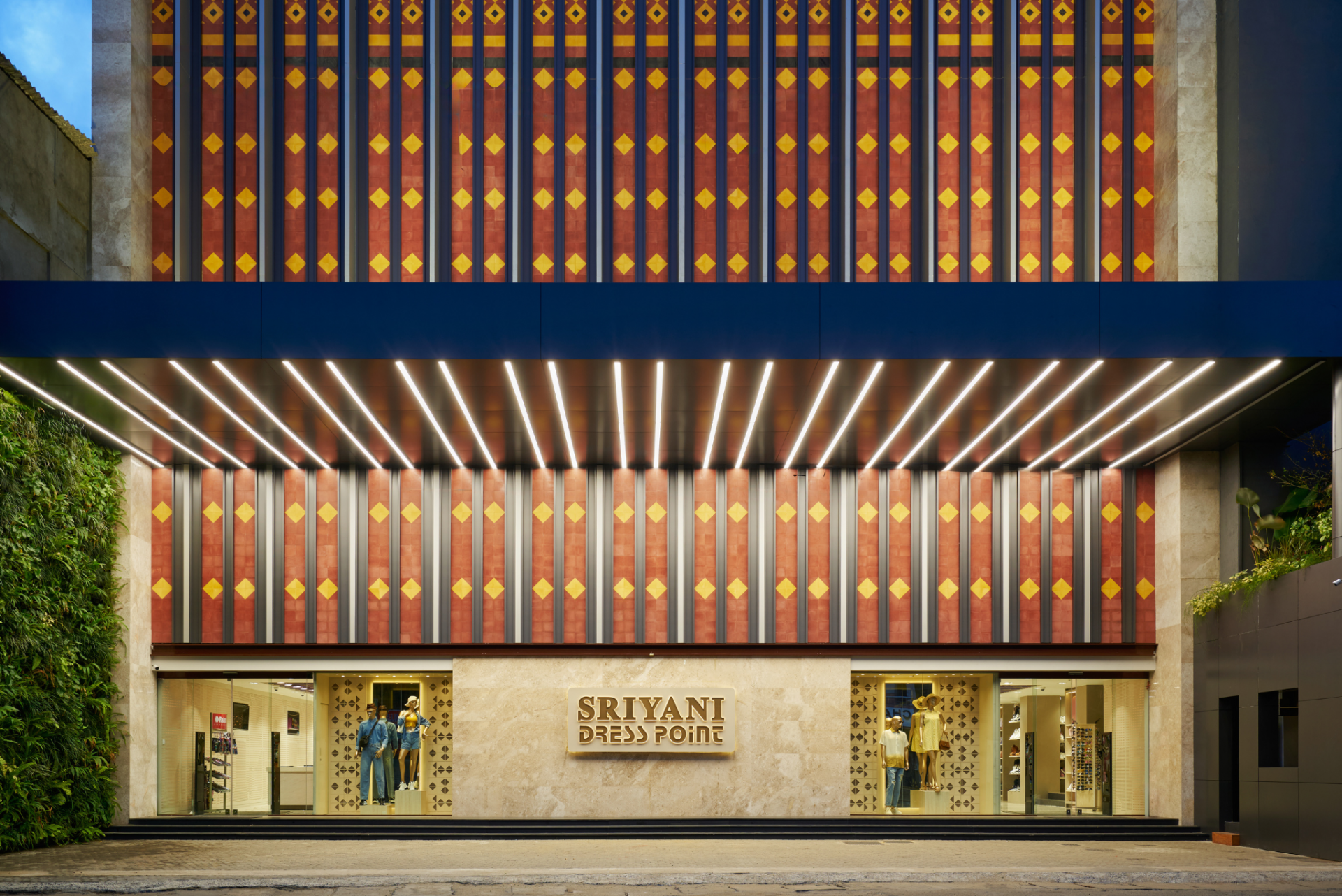 The design draws on Matale’s heritage, referencing the Ādārakoṇḍu motif found in traditional Sri Lankan lacquer work. This influence is expressed through strong vertical lines, geometric compositions, and a vivid yet balanced palette that gives the façade a distinct visual identity. Inside, the design language continues through CNC-cut detailing, geometric counter compositions, and a material palette that combines patterned cement tiles, aluminum elements, gray finishes, and timber textures. Among the project’s defining features is the integration of three façade segments into one cohesive expression, while structural constraints were incorporated into storage and display areas to support functionality and customer movement.