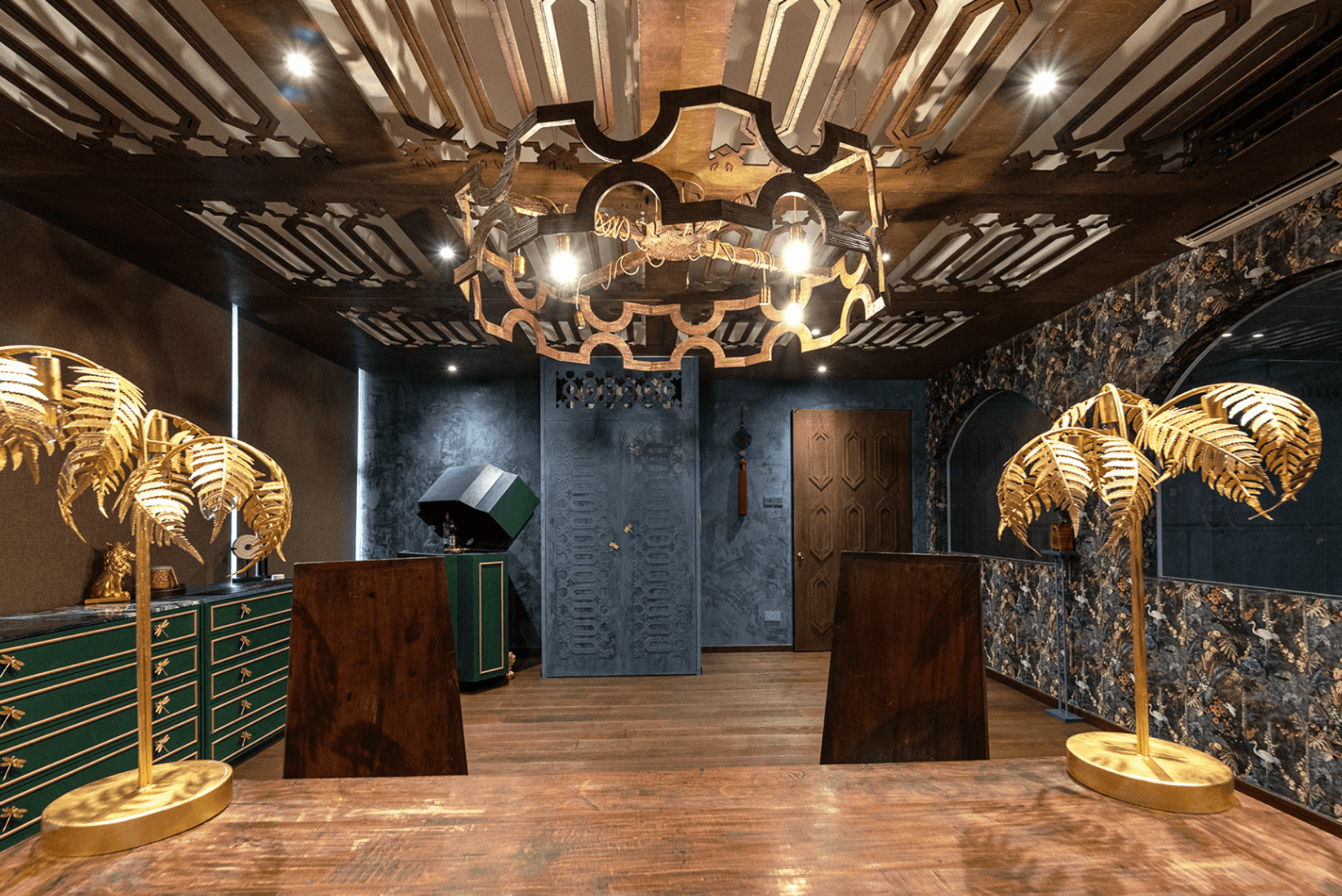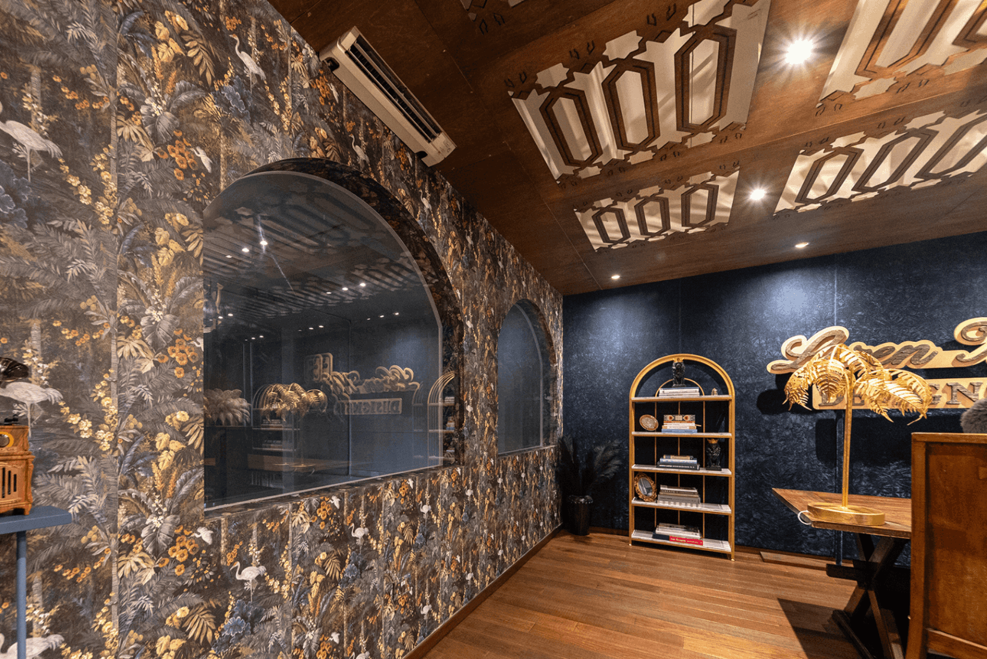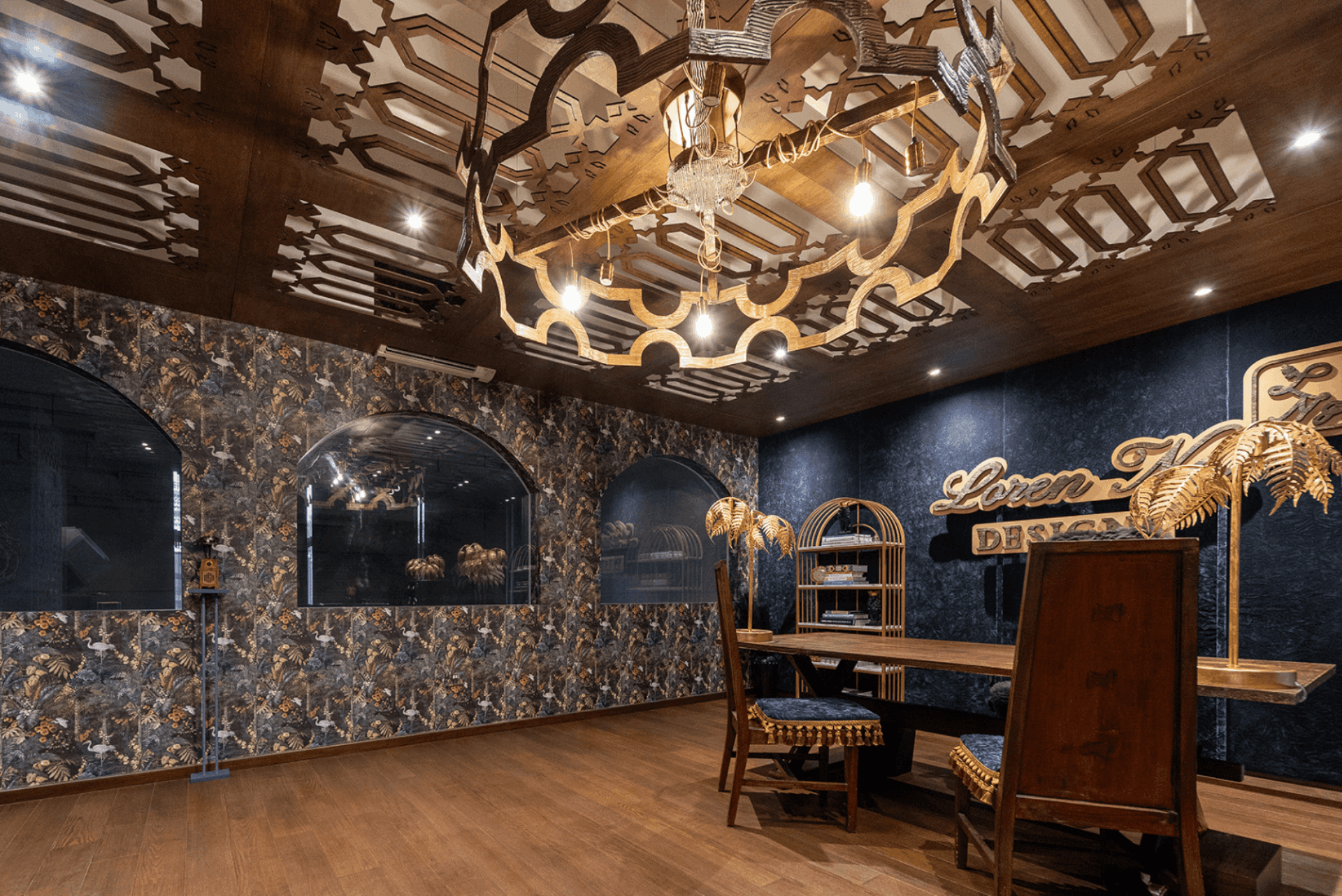 The Woodlands Office serves as both a creative workspace and a brand statement—a living canvas where design and soul intersect. The main studio is anchored by a dramatic CNC-cut timber ceiling inspired by Moroccan architecture, while a Mediterranean-influenced stairway provides sculptural elegance. Carefully curated furniture pieces infuse layers of meaning, including a solid teak dining table repurposed from the founder’s first home, a custom velvet chair with tassel trim, and a European-sourced console. Playful lighting, such as a gold-leaf palm frond lamp and feather-lined floor lamp, adds a sense of whimsy and refinement.