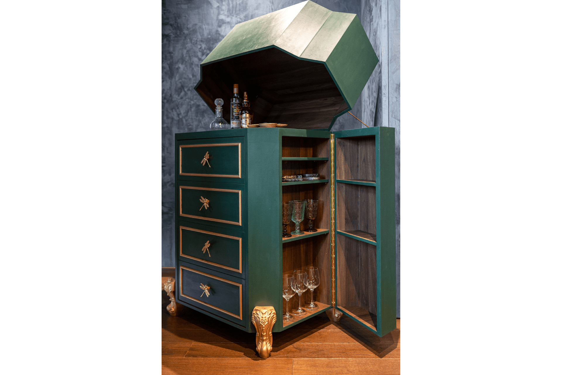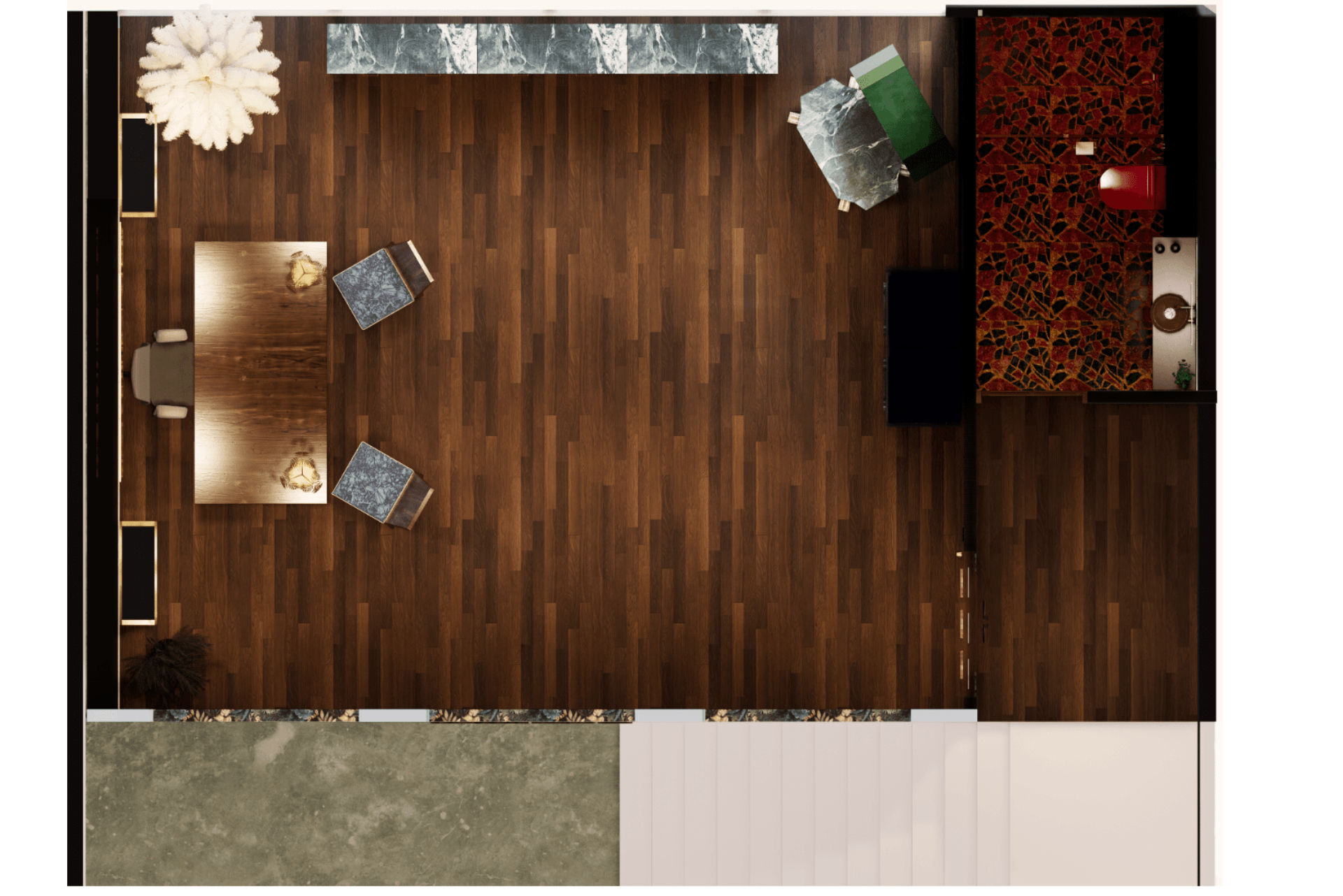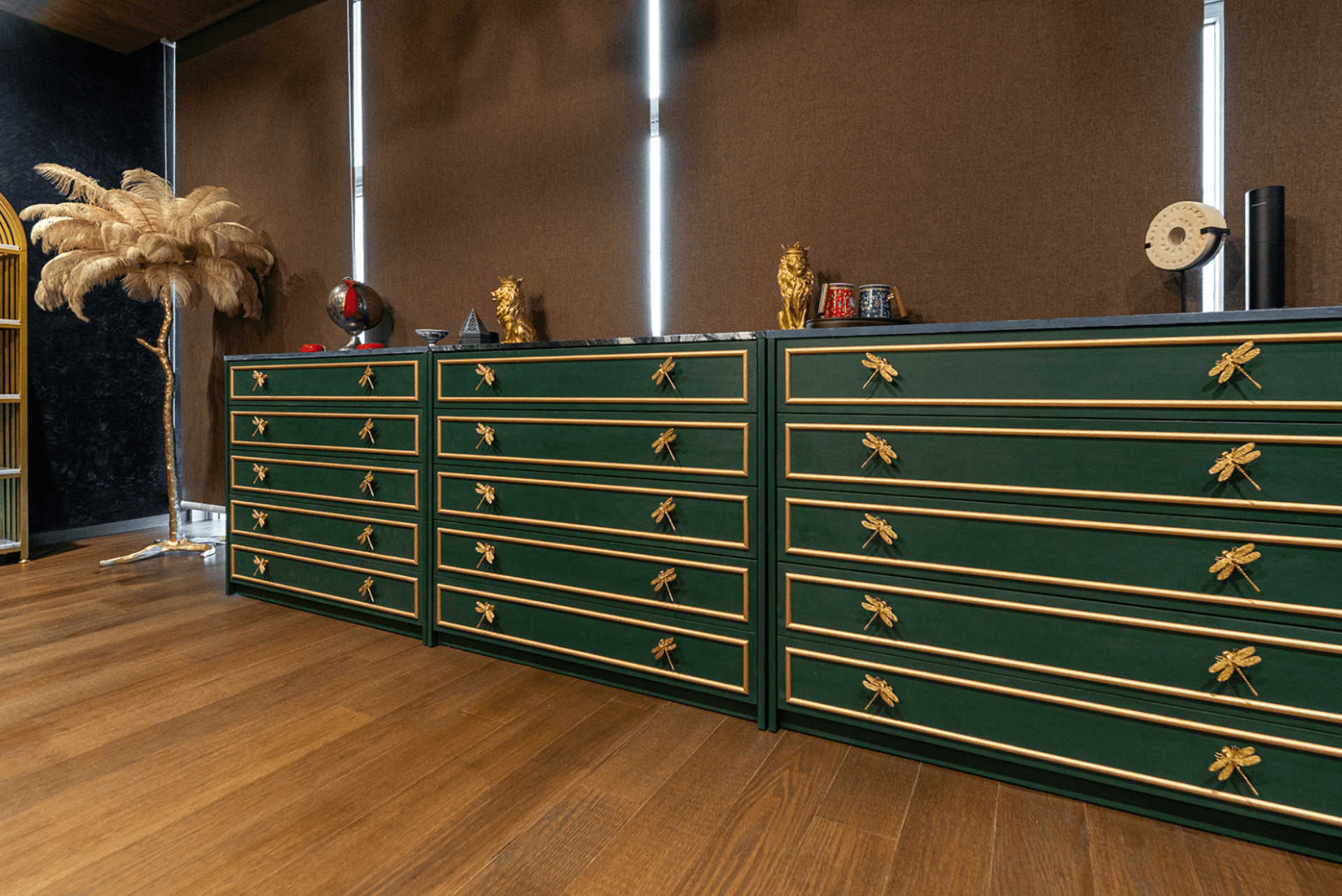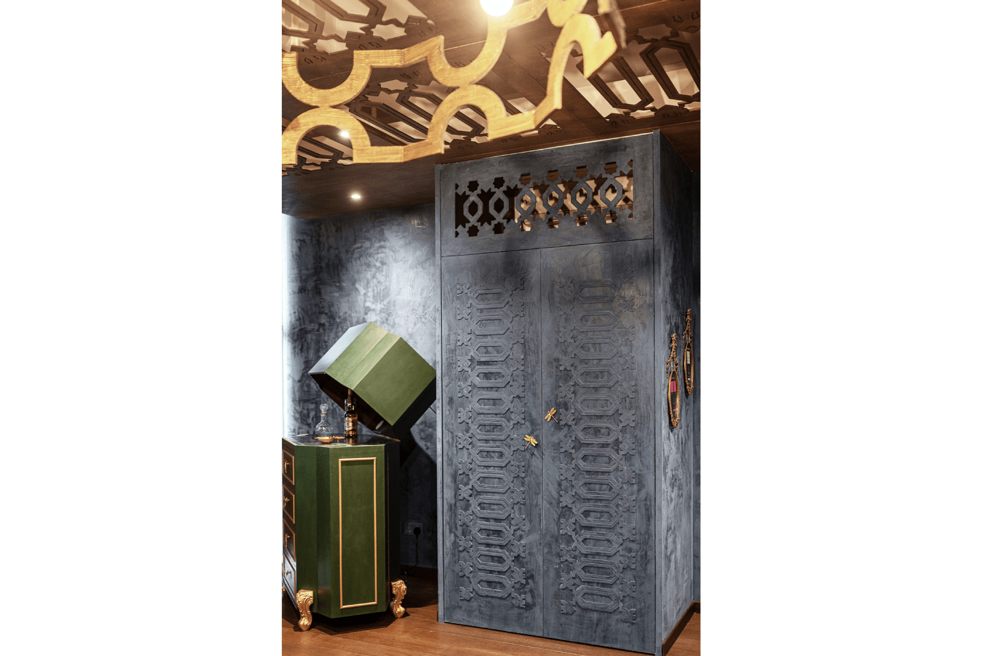 The Woodlands Office serves as both a creative workspace and a brand statement—a living canvas where design and soul intersect. The main studio is anchored by a dramatic CNC-cut timber ceiling inspired by Moroccan architecture, while a Mediterranean-influenced stairway provides sculptural elegance. Carefully curated furniture pieces infuse layers of meaning, including a solid teak dining table repurposed from the founder’s first home, a custom velvet chair with tassel trim, and a European-sourced console. Playful lighting, such as a gold-leaf palm frond lamp and feather-lined floor lamp, adds a sense of whimsy and refinement.
