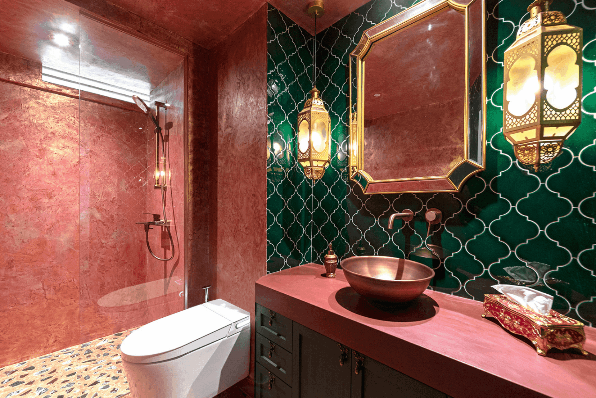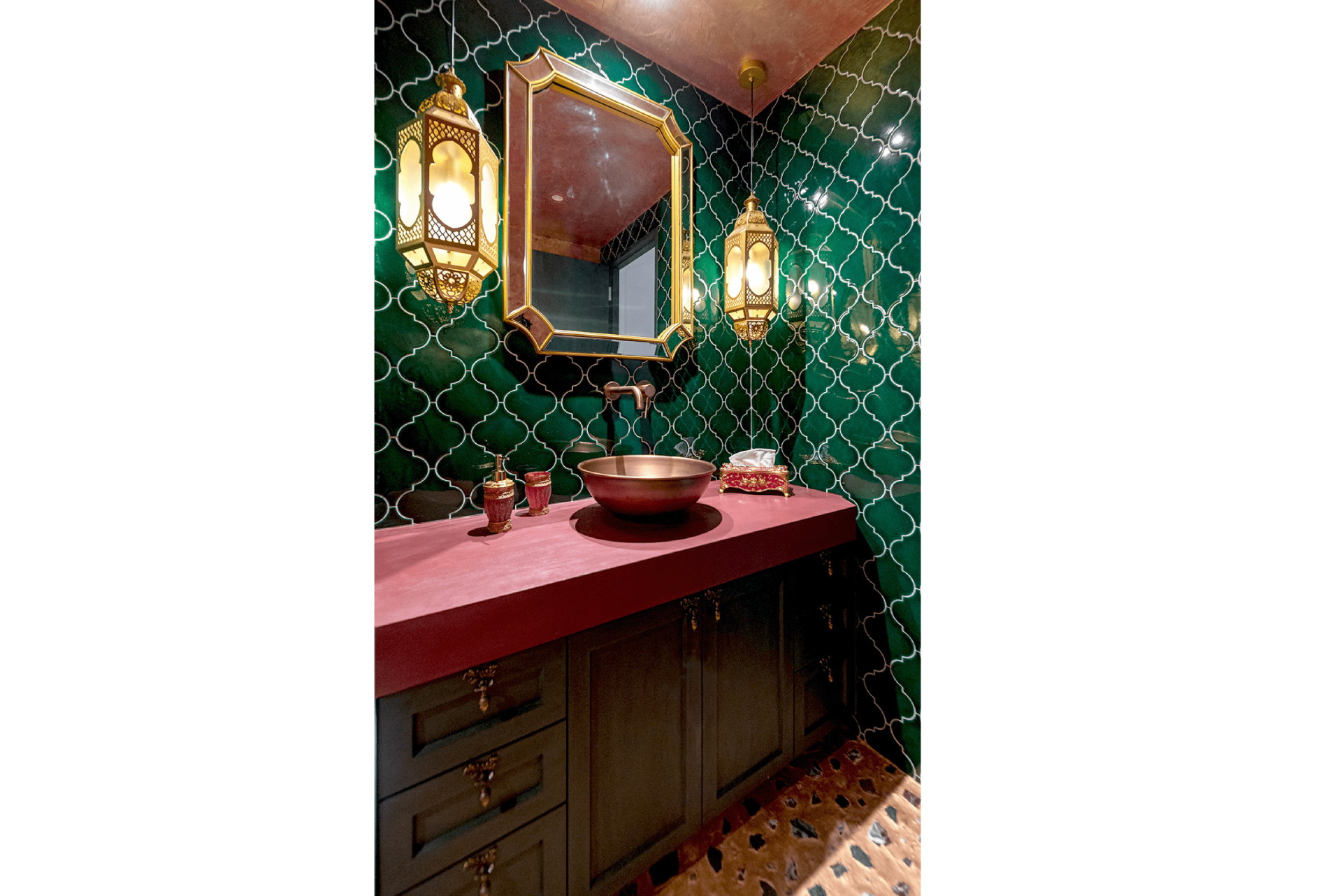 Materiality plays a central role, with hand-applied stucco veneziano walls capturing light throughout the day and cabinetry in bold hues with brushed brass details balancing function with luxury. The jewel-box powder room evokes Moroccan interiors, featuring mosaic marble flooring with bronze-copper grout and a vanity in aged chalk paint—an intimate, tactile, and artful retreat.