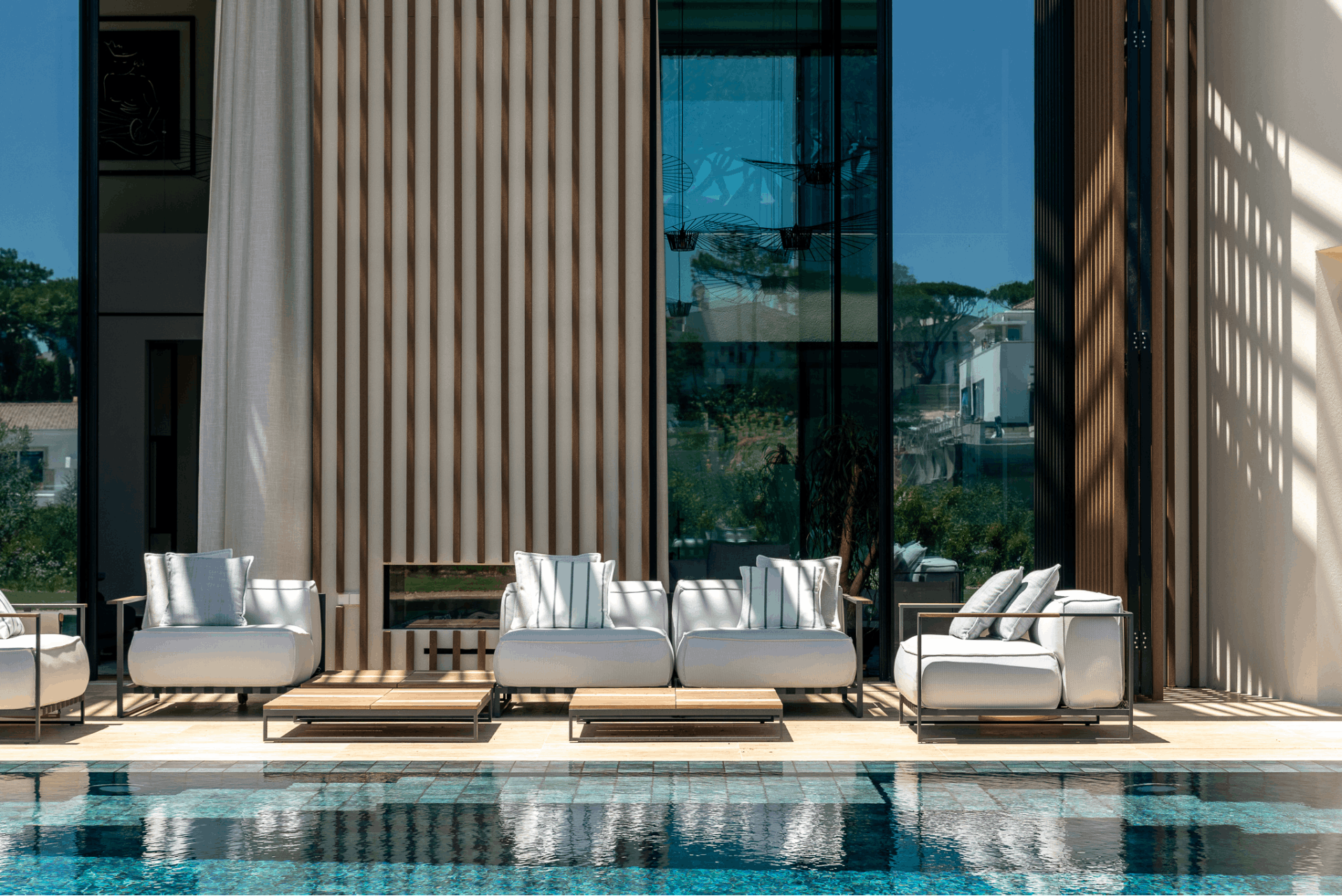 The firm’s design language is rooted in clarity. Clean geometries, carefully framed views, and a restrained material palette form the foundation of its work. Travertine, timber, and expansive glazing are not simply aesthetic choices; they are tools to shape light, encourage passive cooling, and strengthen the relationship between interior and landscape. Outdoor and indoor spaces flow effortlessly, reflecting the Algarve’s climate while ensuring privacy and comfort.