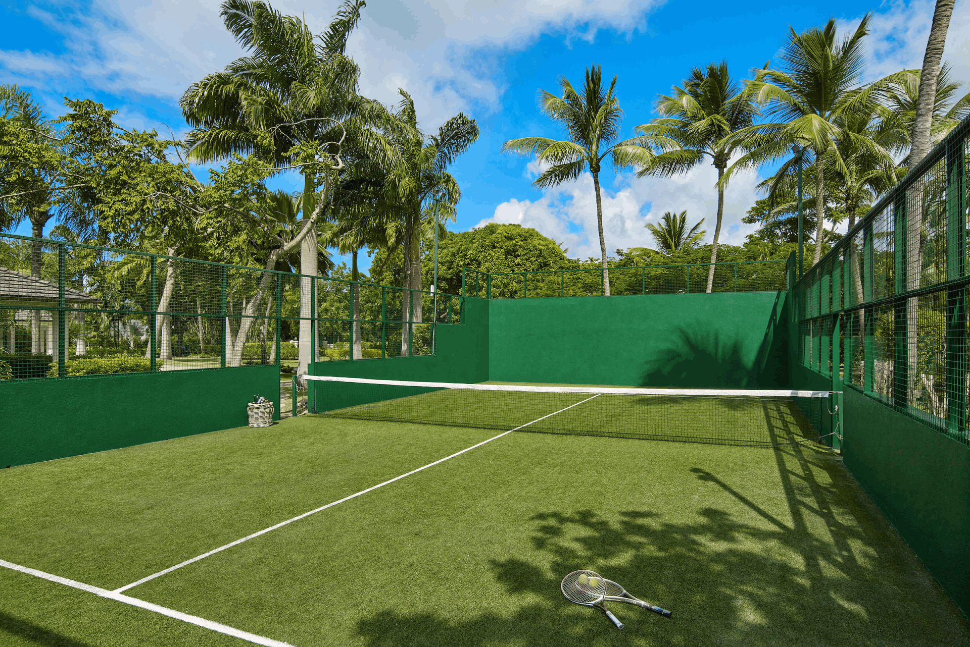Additional amenities include a fitness room, tennis and pickleball courts, media room, and a fully equipped modern kitchen. Designed with both relaxation and activity in mind, the villa also incorporates eco-conscious elements, including a solar-powered system.