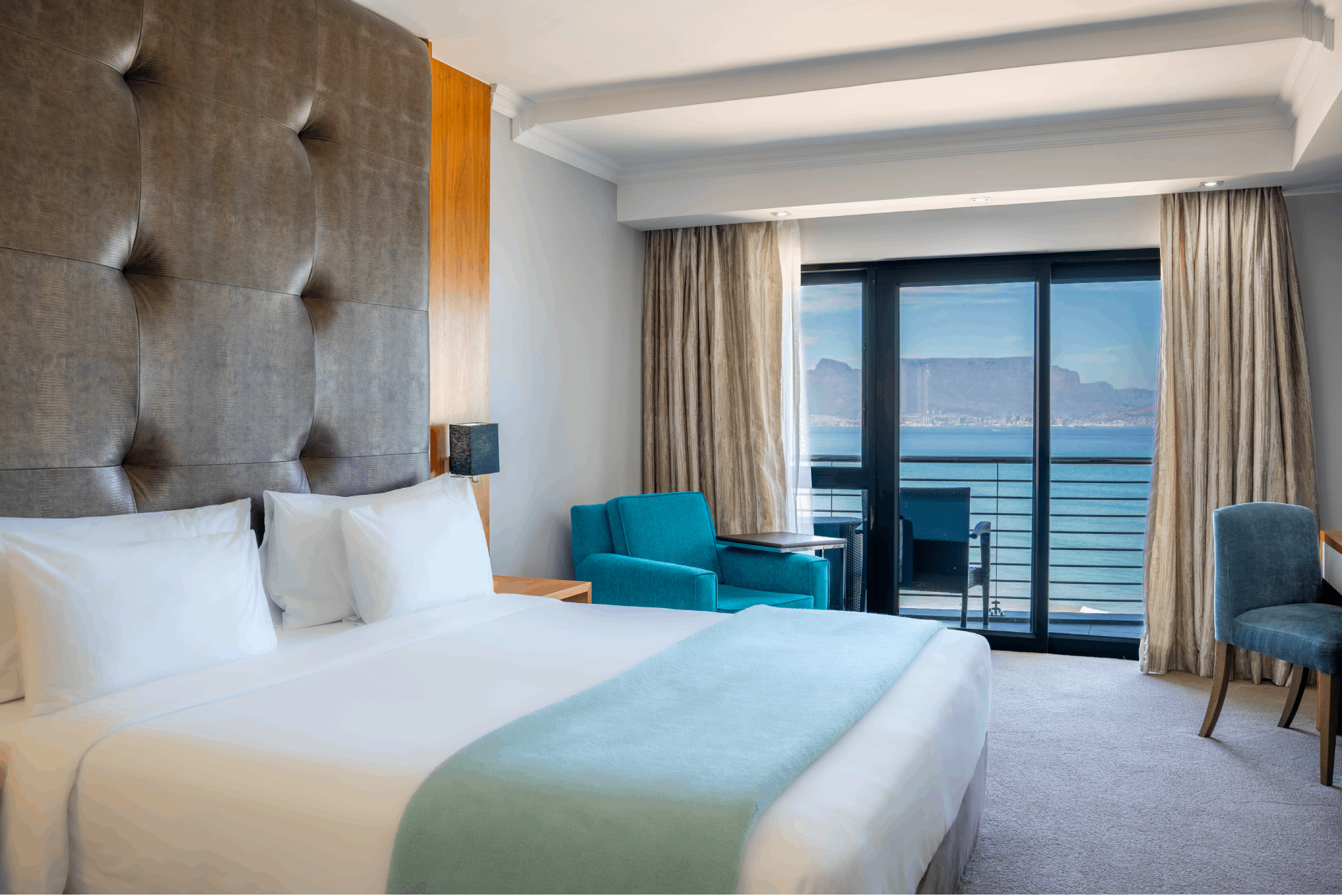 The hotel features 140 ocean-facing rooms and suites, each designed to highlight uninterrupted views of the Atlantic Ocean, with many offering extended panoramas of Table Mountain or Robben Island. Interleading room options make the property well suited for families and groups seeking comfort and convenience.