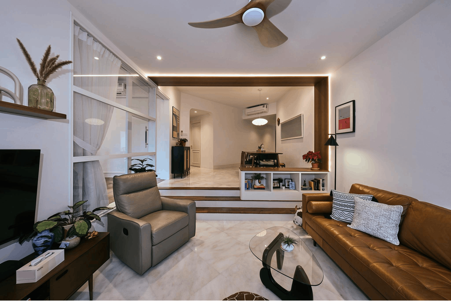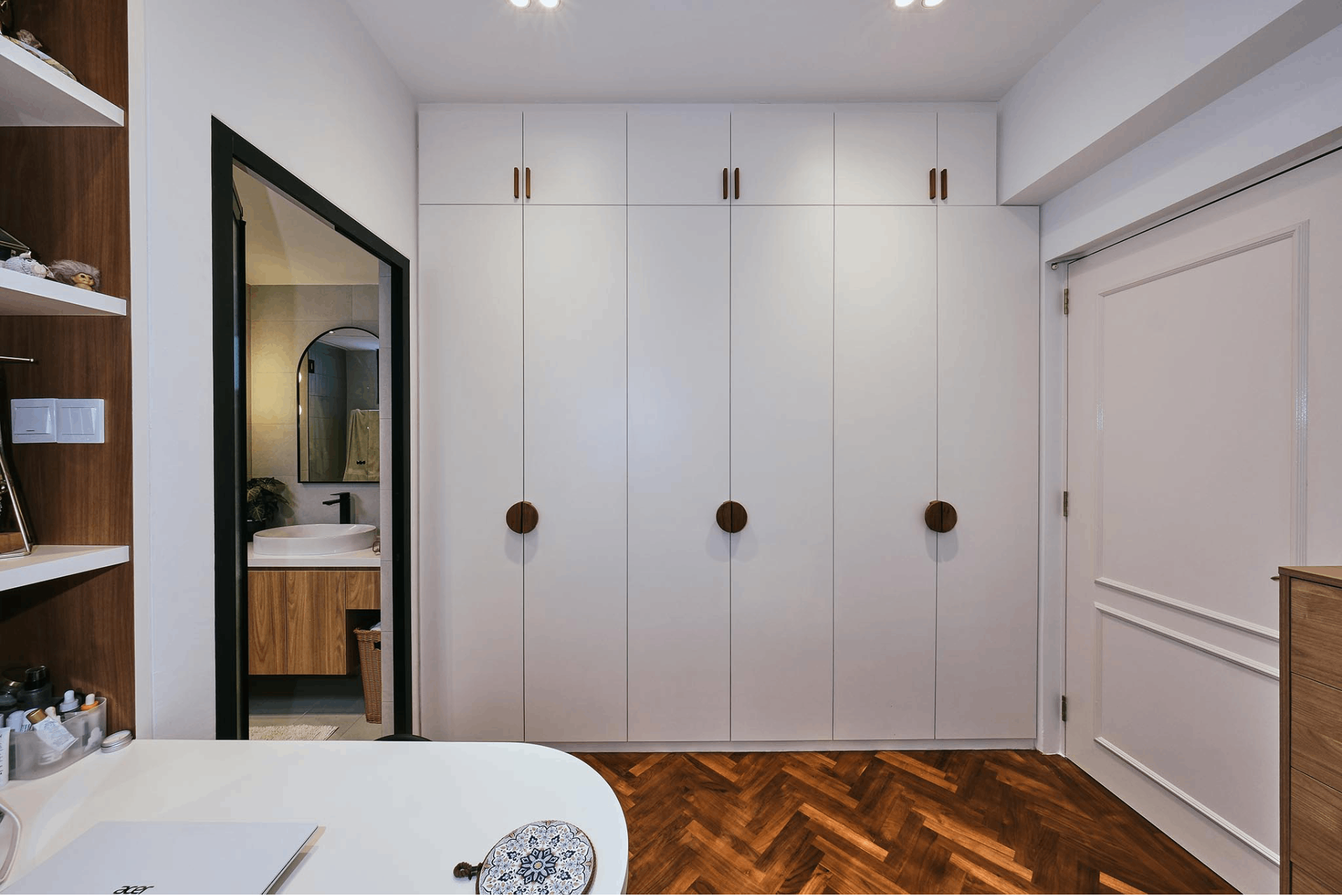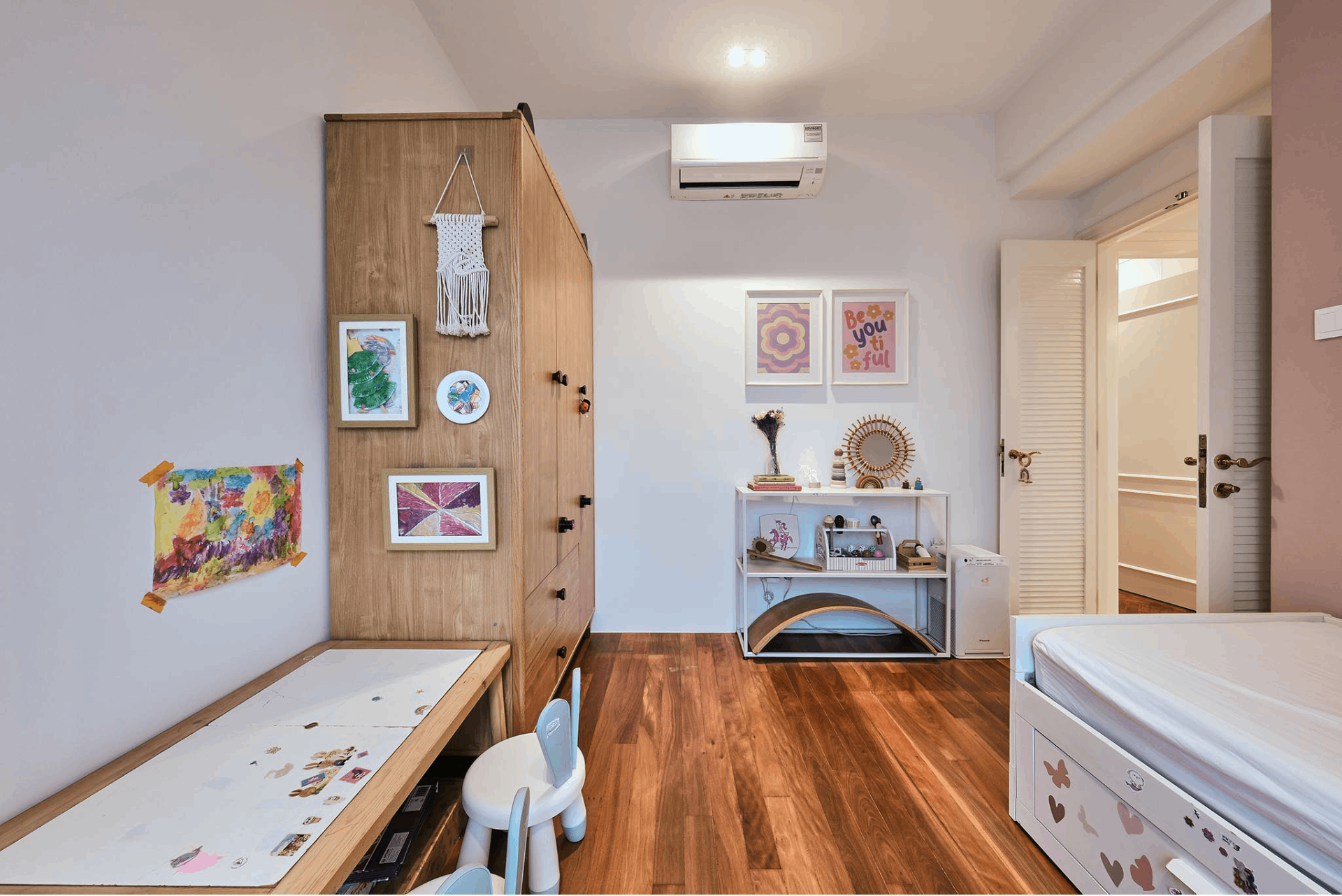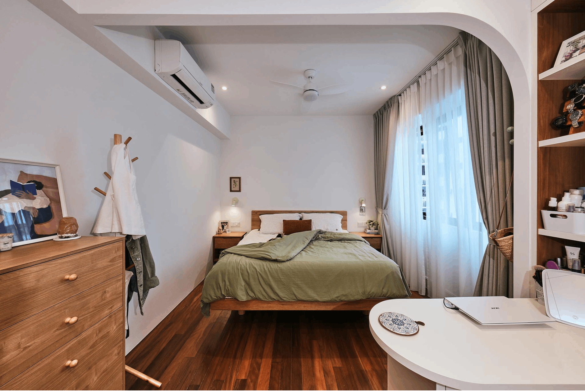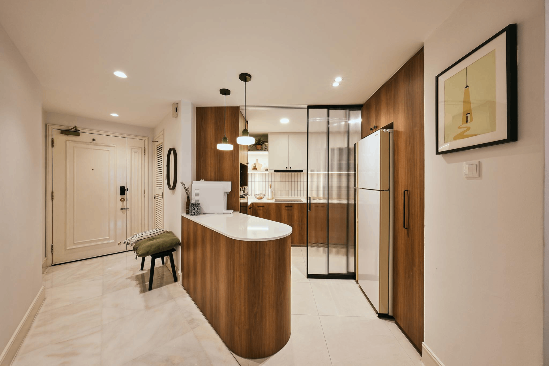 The renovation preserved and integrated select existing features such as sections of the ceiling, original flooring, timber doors, and a study room partition, aligning with the client’s sustainability goals and budget considerations. Key interventions included reconfiguring the kitchen for an open-plan layout, introducing a rounded island designed for safety and accessibility, and splitting the master bedroom to create additional private sleeping quarters for the child.