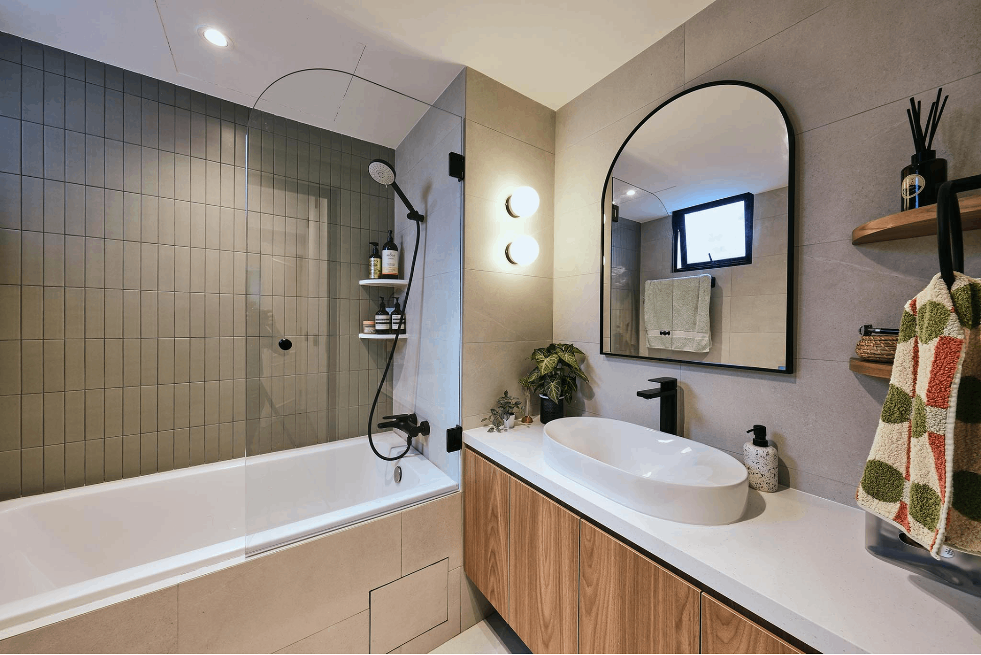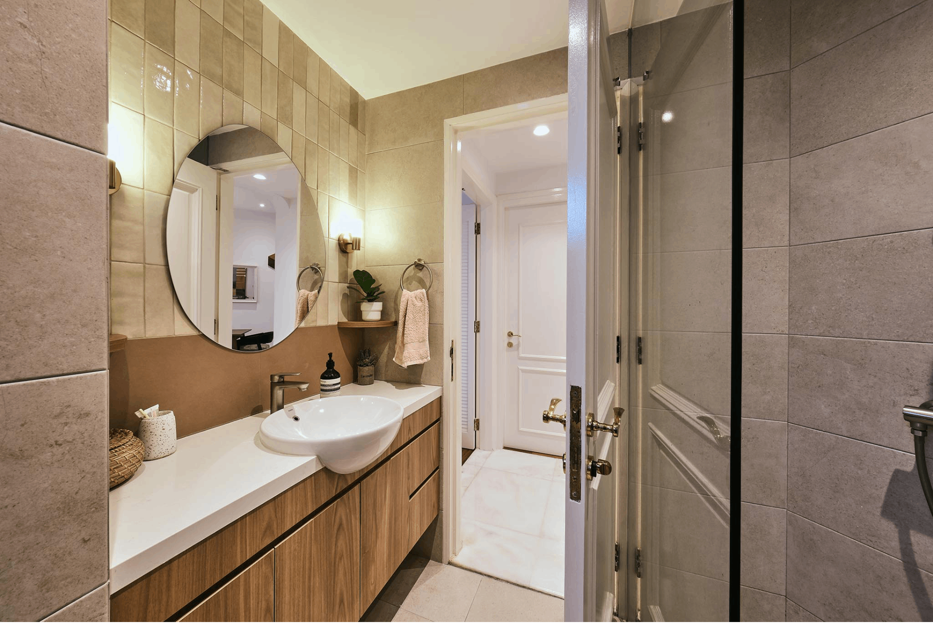 Unique design features highlight HYJK’s signature approach to blending form and function. A bold rectangular arch between the living and dining areas provides additional seating and storage, while fluted glass sliding doors maintain privacy in the wet kitchen without compromising light. Curved design elements throughout the home create a gentle, welcoming flow, enhancing both aesthetics and everyday usability.