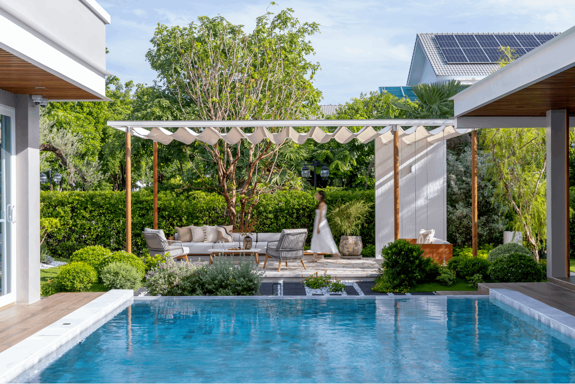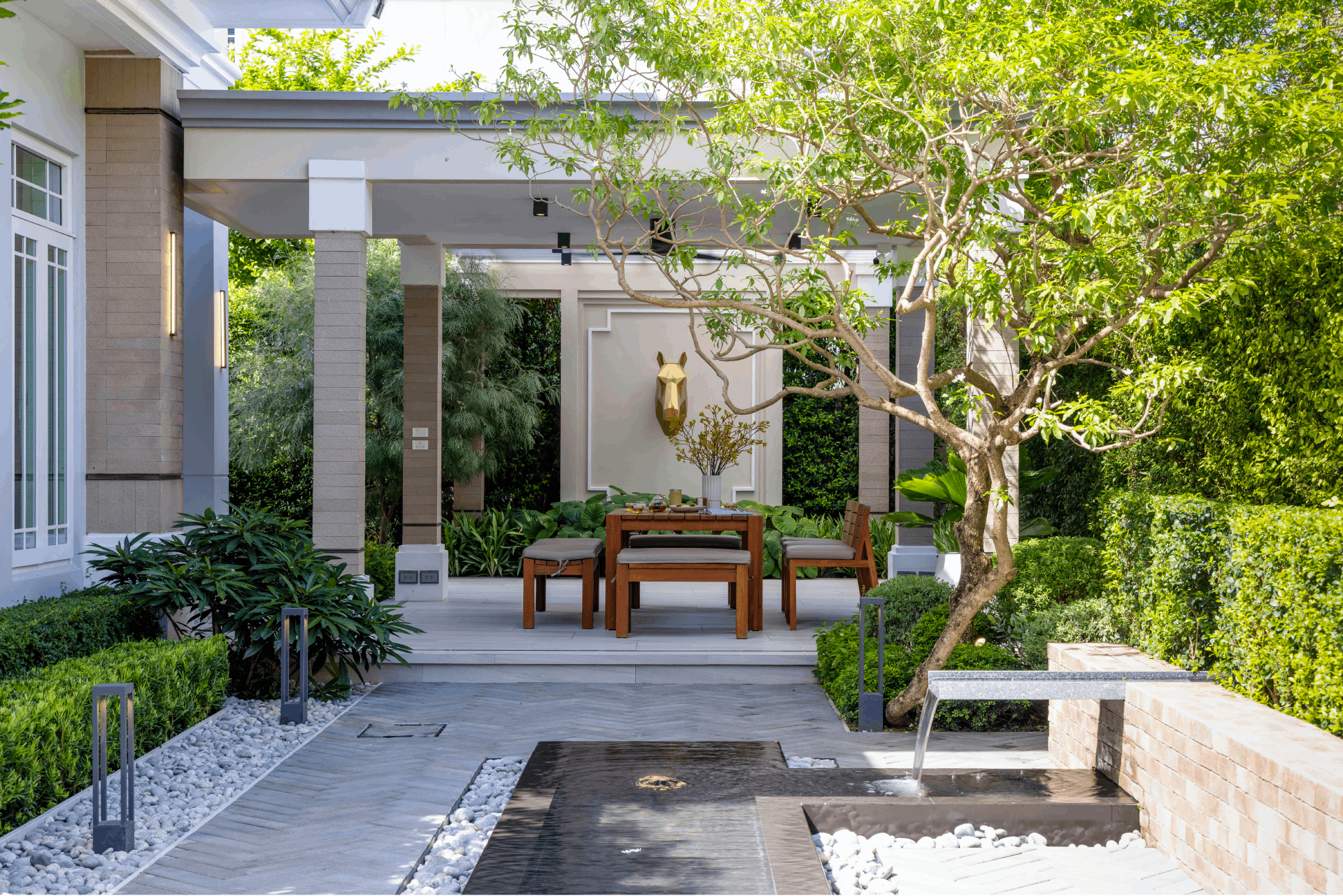 GINGGAANBAI Outdoor Living is a Bangkok-based garden and outdoor living design studio that has spent over 20 years redefining modern Thai landscape design. Founded by architects and garden designers Tawatchai Sakdikul and Ploytabtim Suksang, the studio was created with a clear purpose: to design gardens as functional extensions of everyday living, shaped by lifestyle, emotion, and nature. The name GINGGAANBAI—meaning branch, stem, and leaf—reflects a design philosophy rooted in growth, connection, and organic balance.