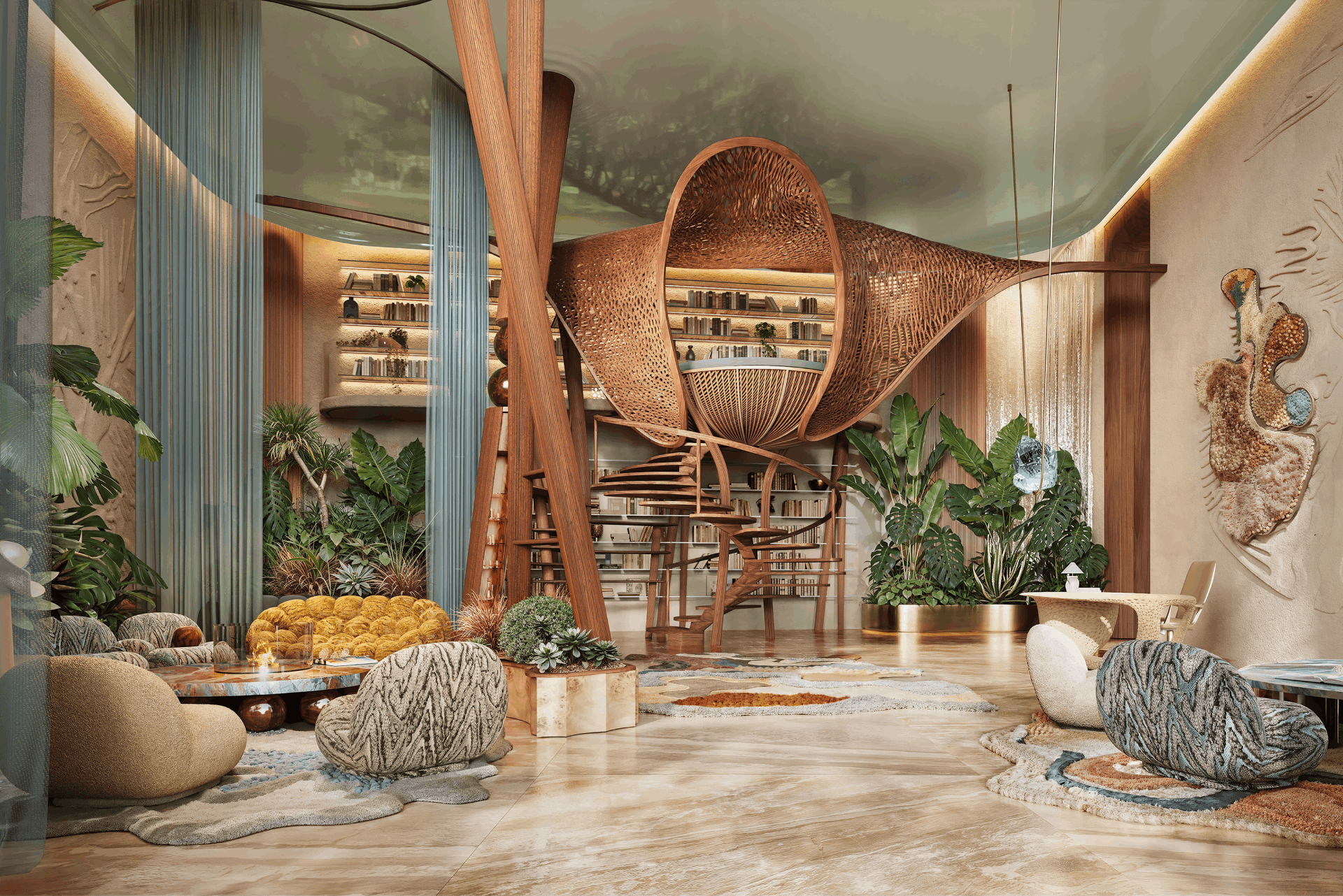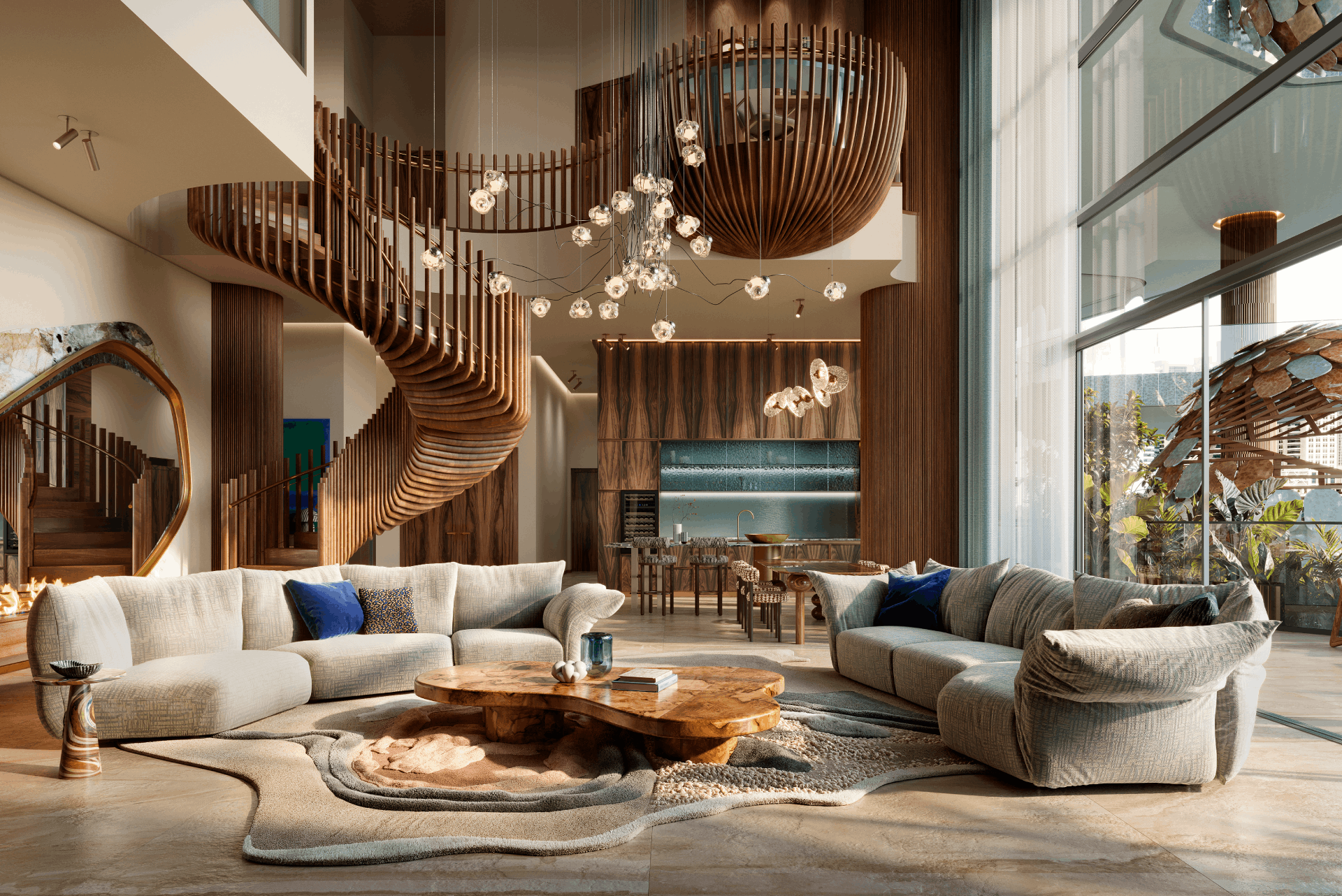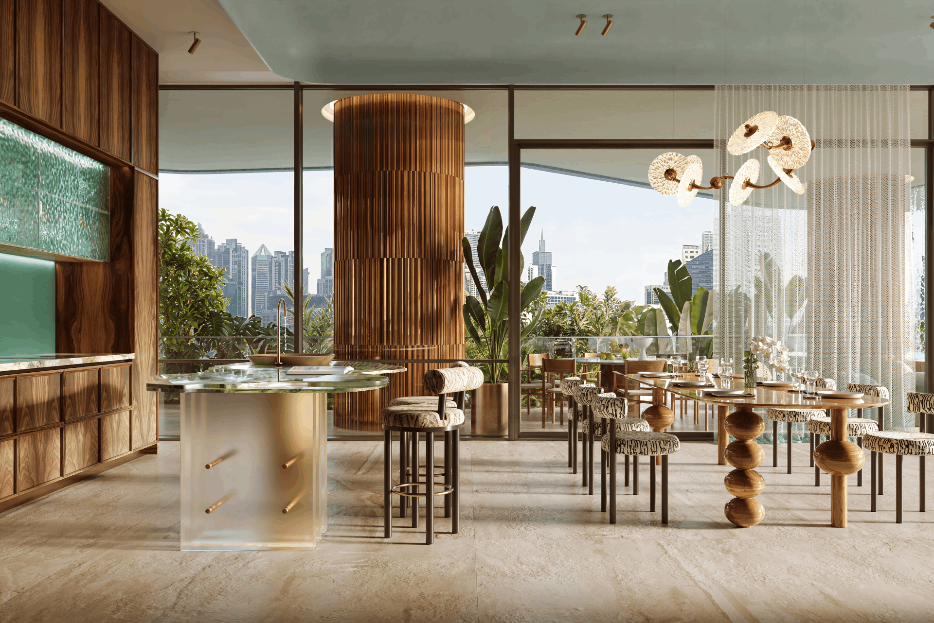 A dedicated double wellness level expands the lifestyle into a sanctuary for longevity. Residents have access to six pools, including a 25-meter infinity pool and an indoor pool, alongside saunas, cryotherapy, and spa therapies inspired by both Eastern and Western traditions. Signature elements such as the Crystal Sound Meditation Pyramid, a contemplative labyrinth, and a Tiger Eye barefoot pathway offer immersive experiences for reflection, recalibration, and renewal.