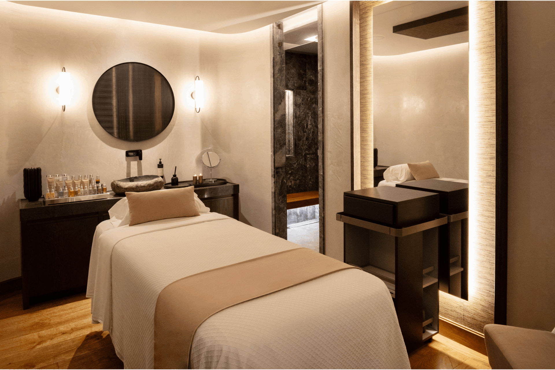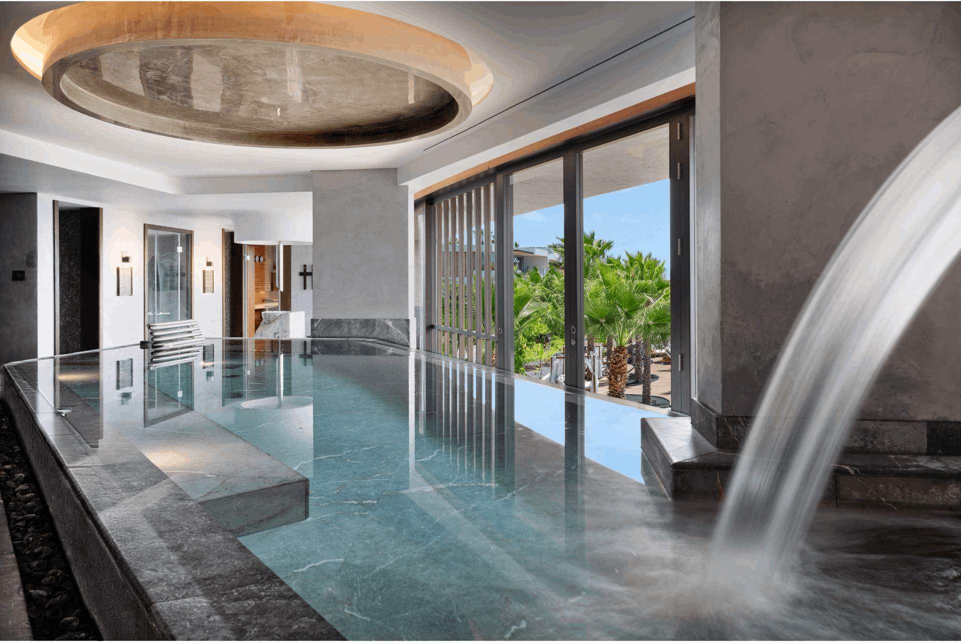 At the heart of the spa lies its immersive water circuit, a tranquil flow of hydrotherapy experiences that includes a thermal pool, sauna, steam bath, ice fountain, bi-thermal showers, and heated loungers. Ocean views and lush golf course panoramas frame the journey, reconnecting guests with nature’s steadying rhythm.